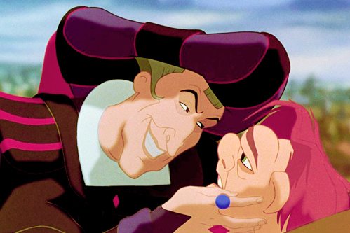 - Em O Corcunda de Notre Damme, Frollo, uma poderosa figura do clero, mantém QuasÃmodo em cárcere privado uma vida, subjugando-o totalmente.